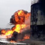 A fuel depot was ablaze at one of Russia’s main logistics hubs for its Ukraine war effort on Friday. Moscow described it as a cross-border air raid by Ukrainian helicopters, the first of its kind in the weeks-long conflict.
